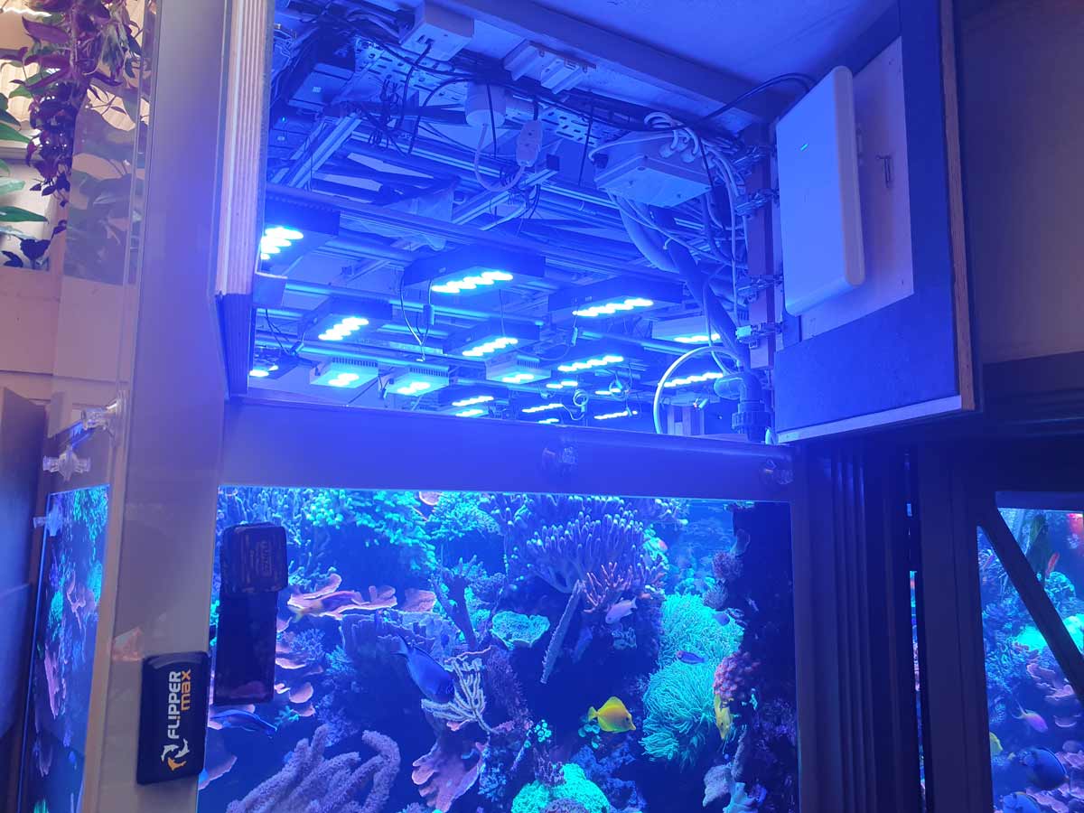 The installation recreates a fully functioning tropical reef ecosystem in a London basement environment — requiring precise environmental control, continuous monitoring, and absolute network reliability to sustain coral growth, marine life, specialist lighting systems, circulation pumps, filtration, and temperature regulation.